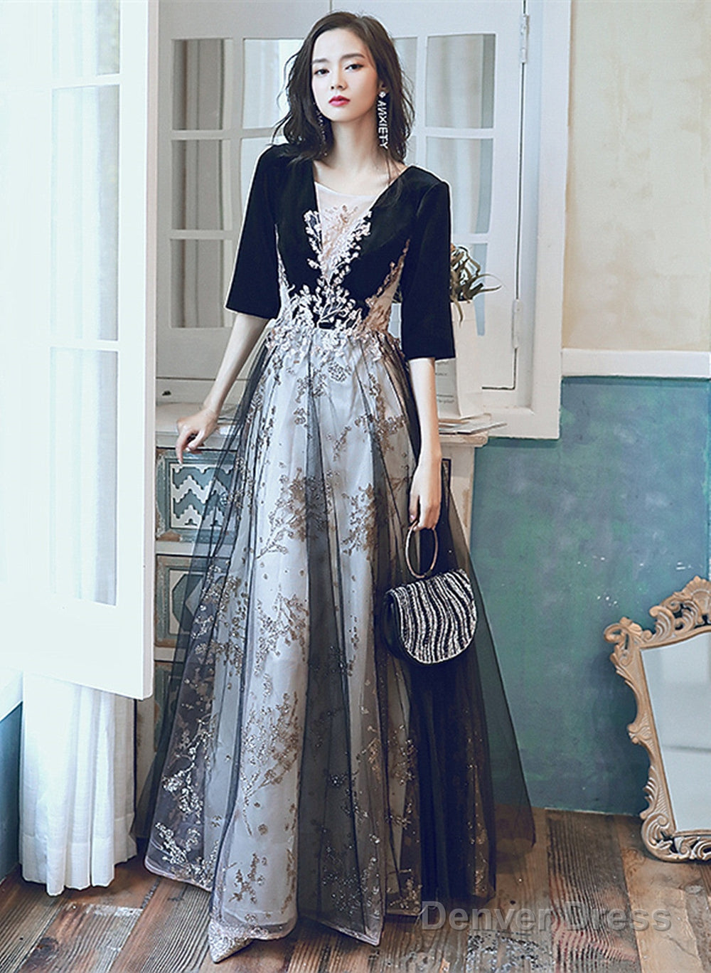 A-Line Black Tulle And Velvet Long Party Dress, Black Prom Dress With Lace Applique