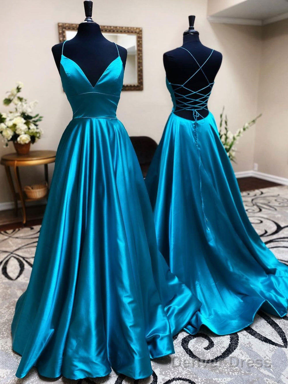 A-Line Blue Satin Long Prom Dress, Blue Formal Evening Dresses