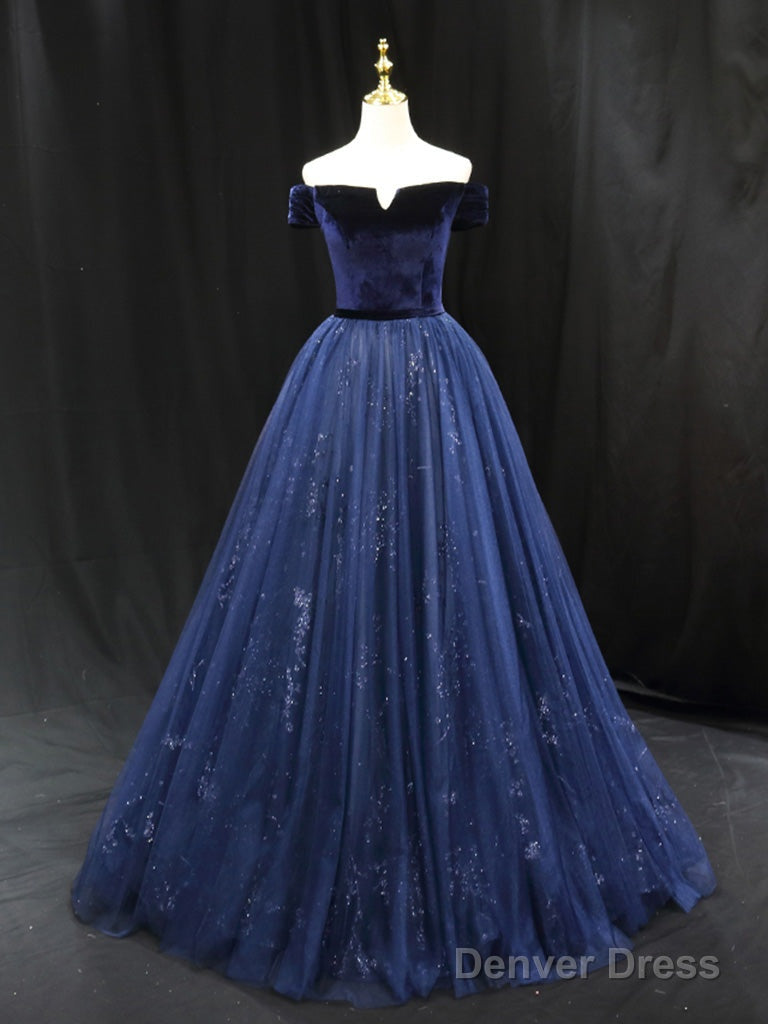 A-Line Blue Tulle Velvet Long Prom Dress, Blue Formal Evening Dress