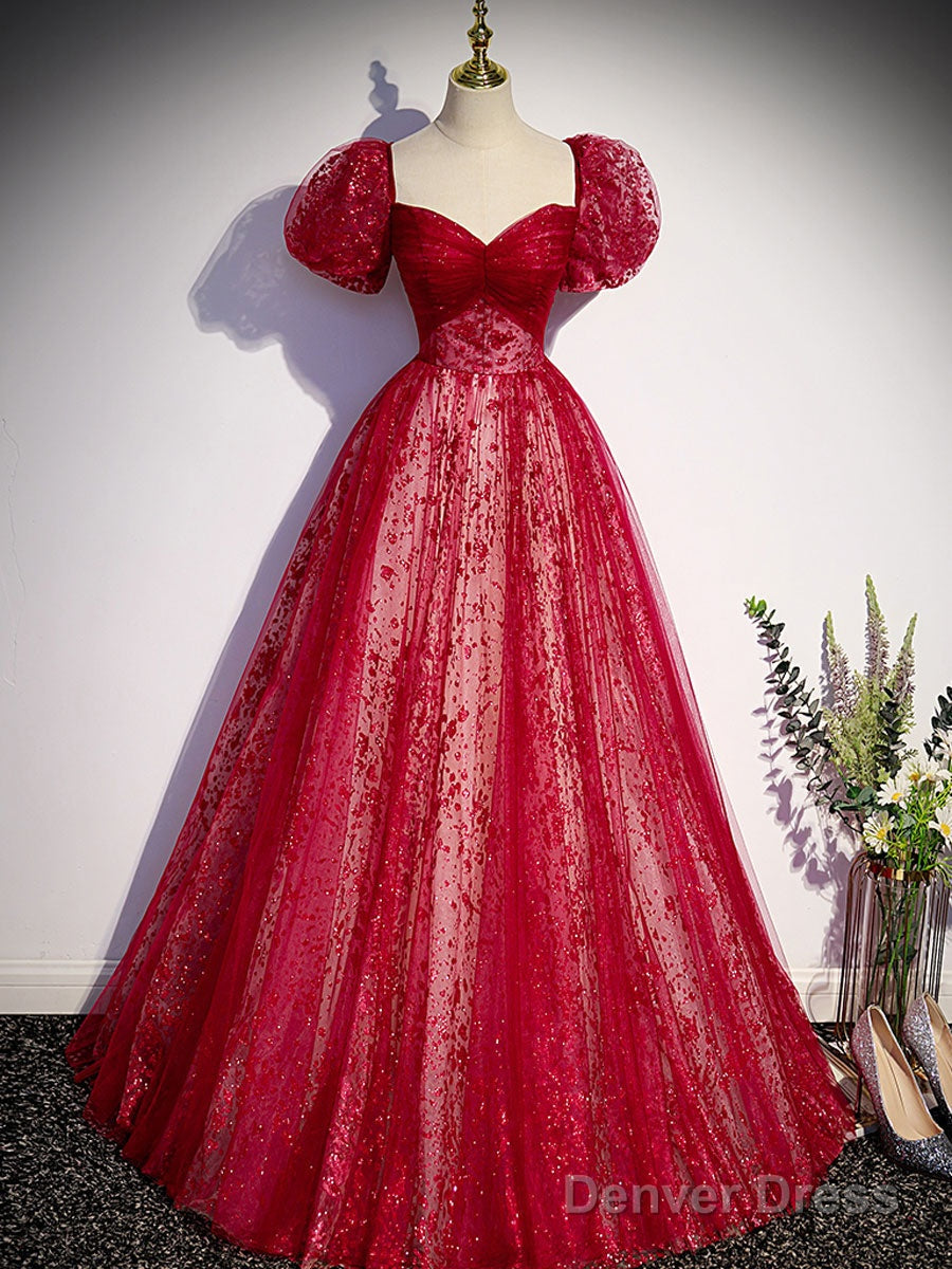 A Line Burgundy Tulle Sequin Long Prom Dress, Burgundy Formal Dress