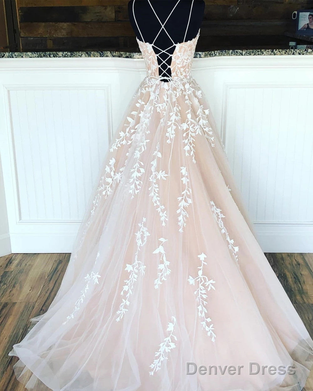 A Line Champagne Lace Wedding Dresses, Champagne Lace Prom Formal Evening Dresses With Corset Back
