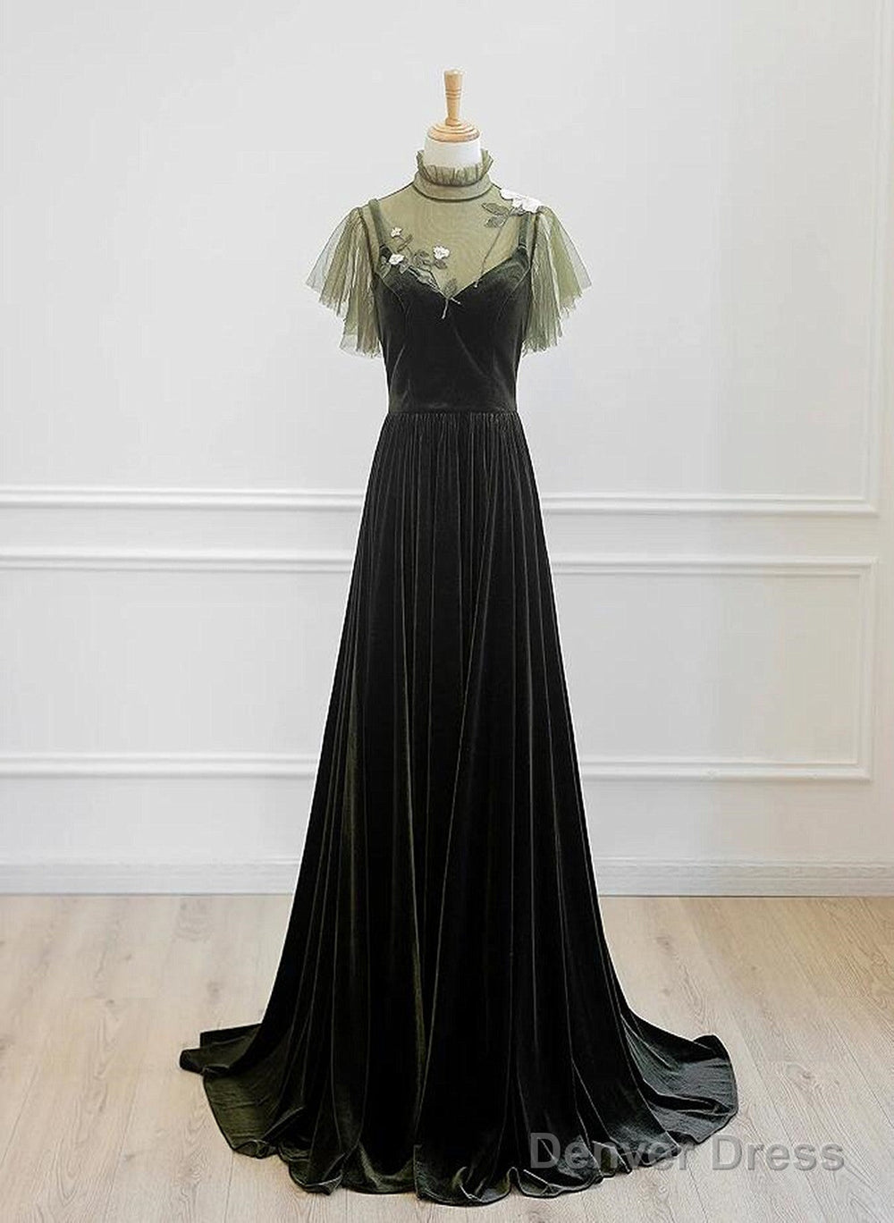 A-Line Green Velvet Long Wedding Party Dress, High Neckline Prom Dress Evening Dress