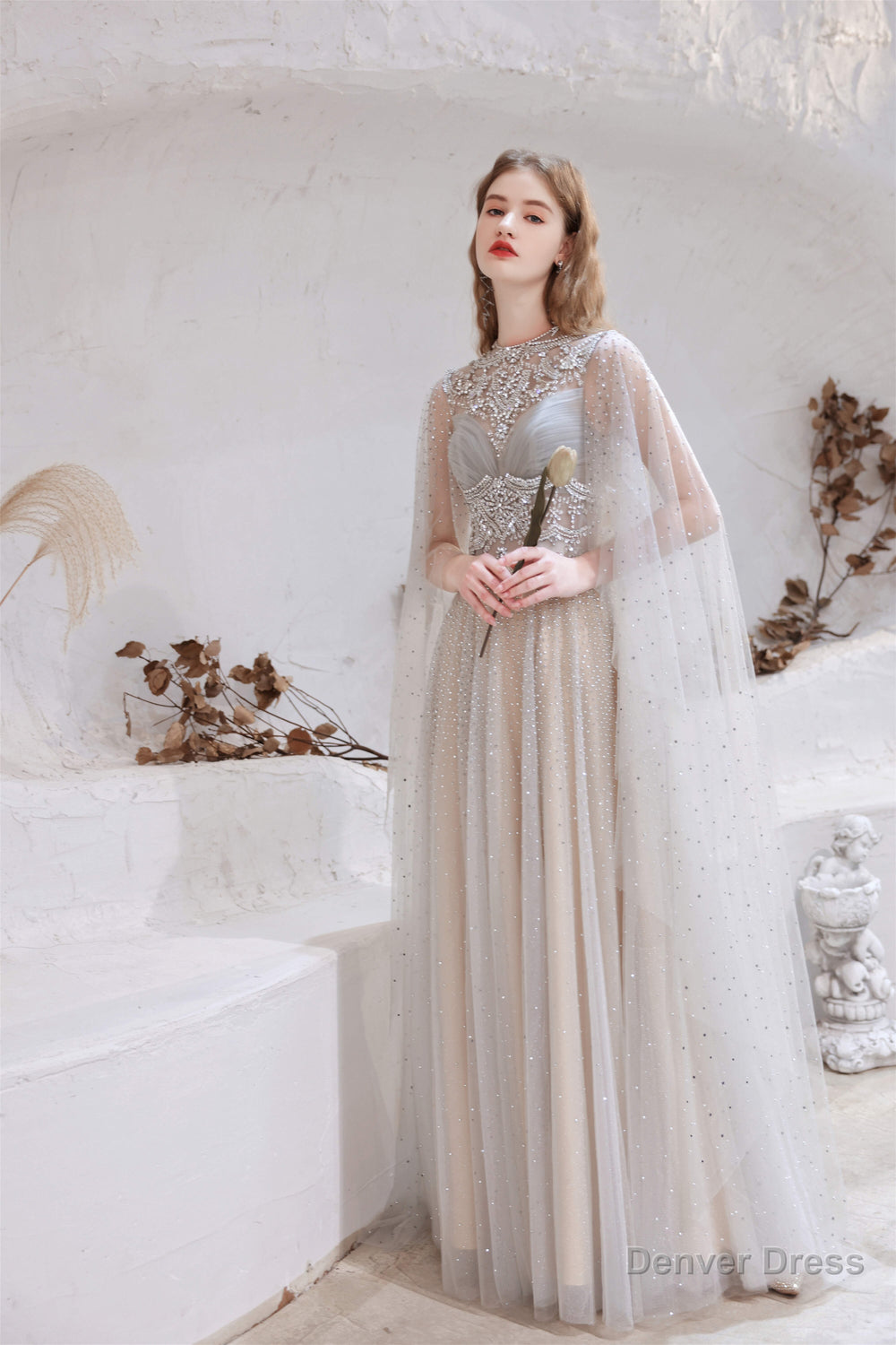 A Line High Neck Sleeveless Beading Tulle Floor Length Prom Dresses