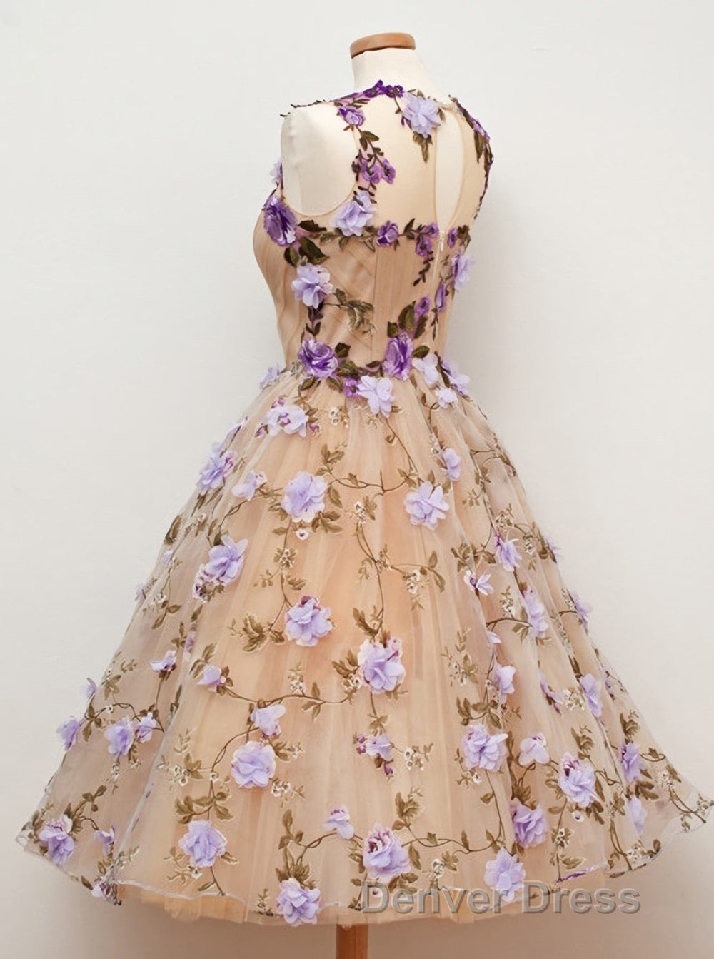 A Line Jewel Tea Length Open Back Champagne Tulle With Appliques Flowers Short Homecoming Dresses