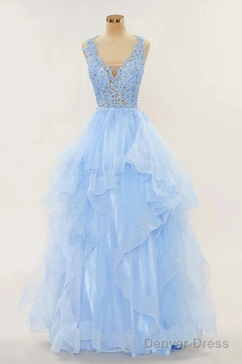A-Line Long Layers Lace Prom Dresses Light Blue Beaded Appliques