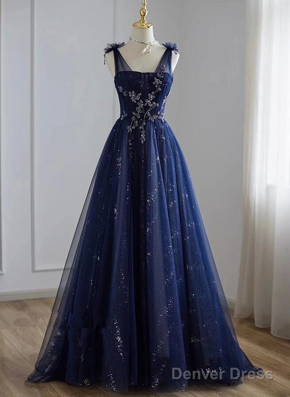 A-Line Navy Blue Tulle Beaded V-Neckline Party Dress, Navy Blue Shiny Tulle Prom Dress