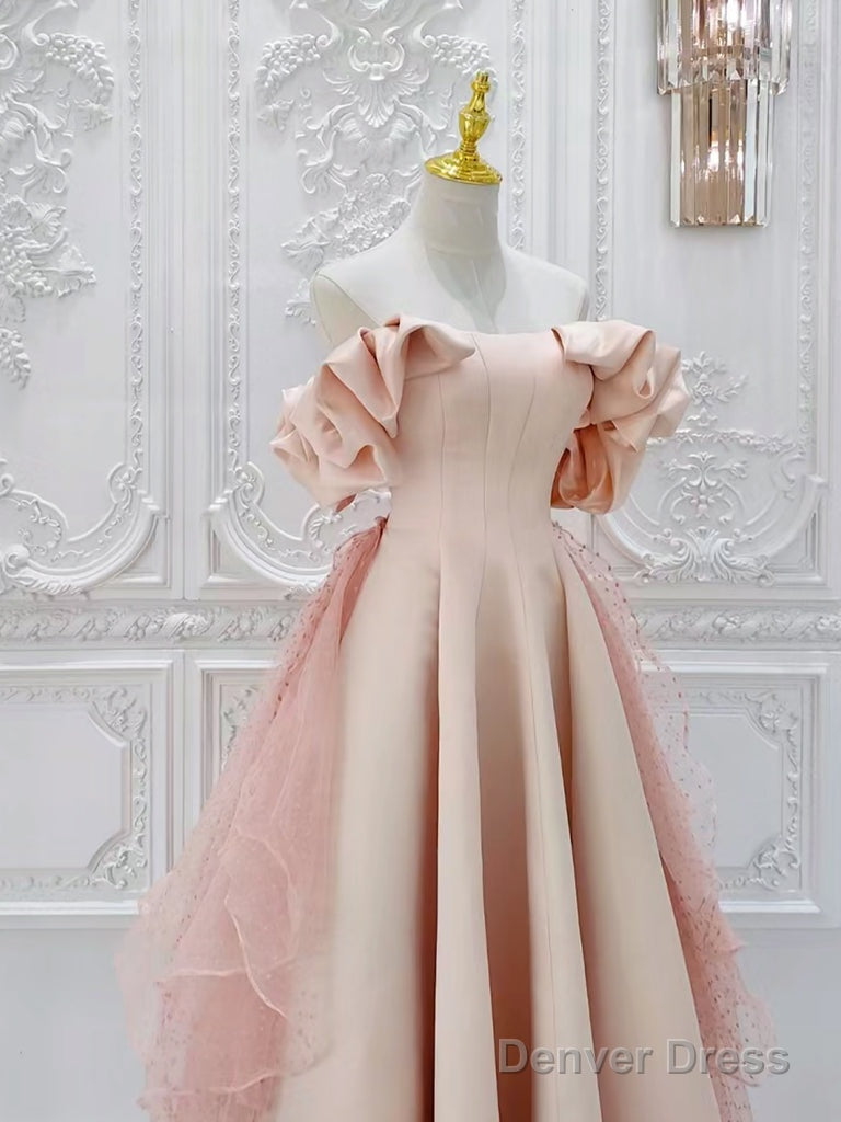 A-Line Off Shoulder Statin Tulle Pink Long Prom Dress, Pink Long Formal Dress