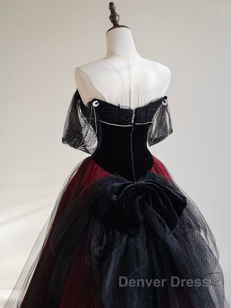 A-Line Off Shoulder Tulle Black/Burgundy Long Prom Dresses