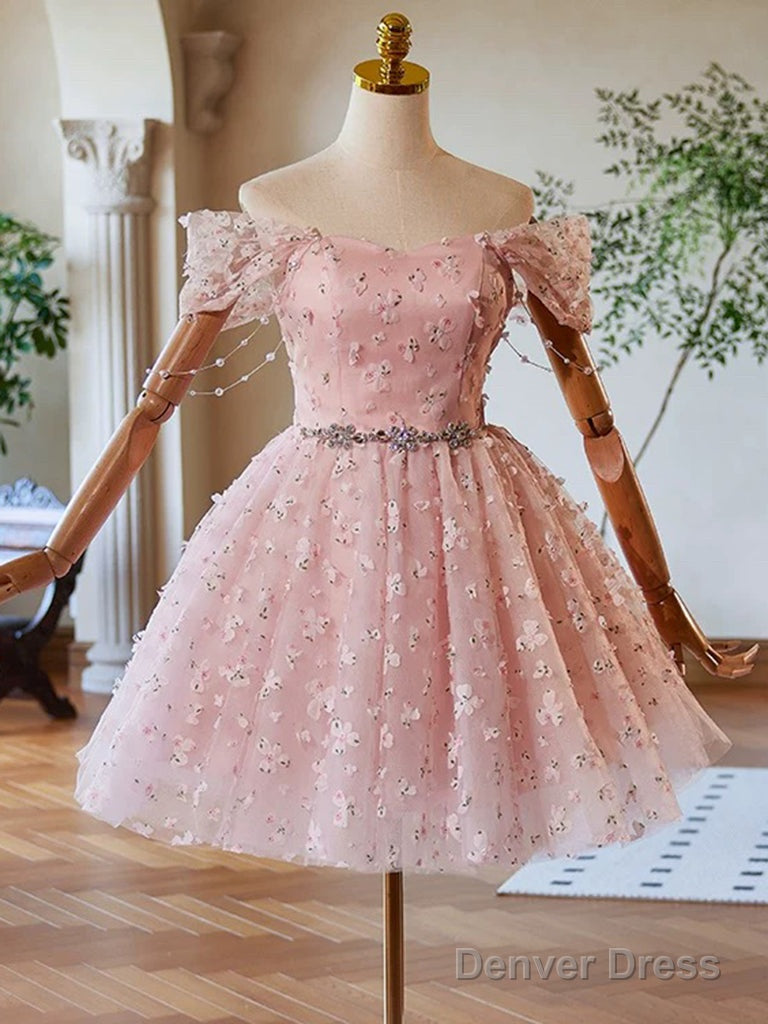 A-Line Off Shoulder Tulle Lace Pink Short Prom Dress, Pink Homecoming Dress