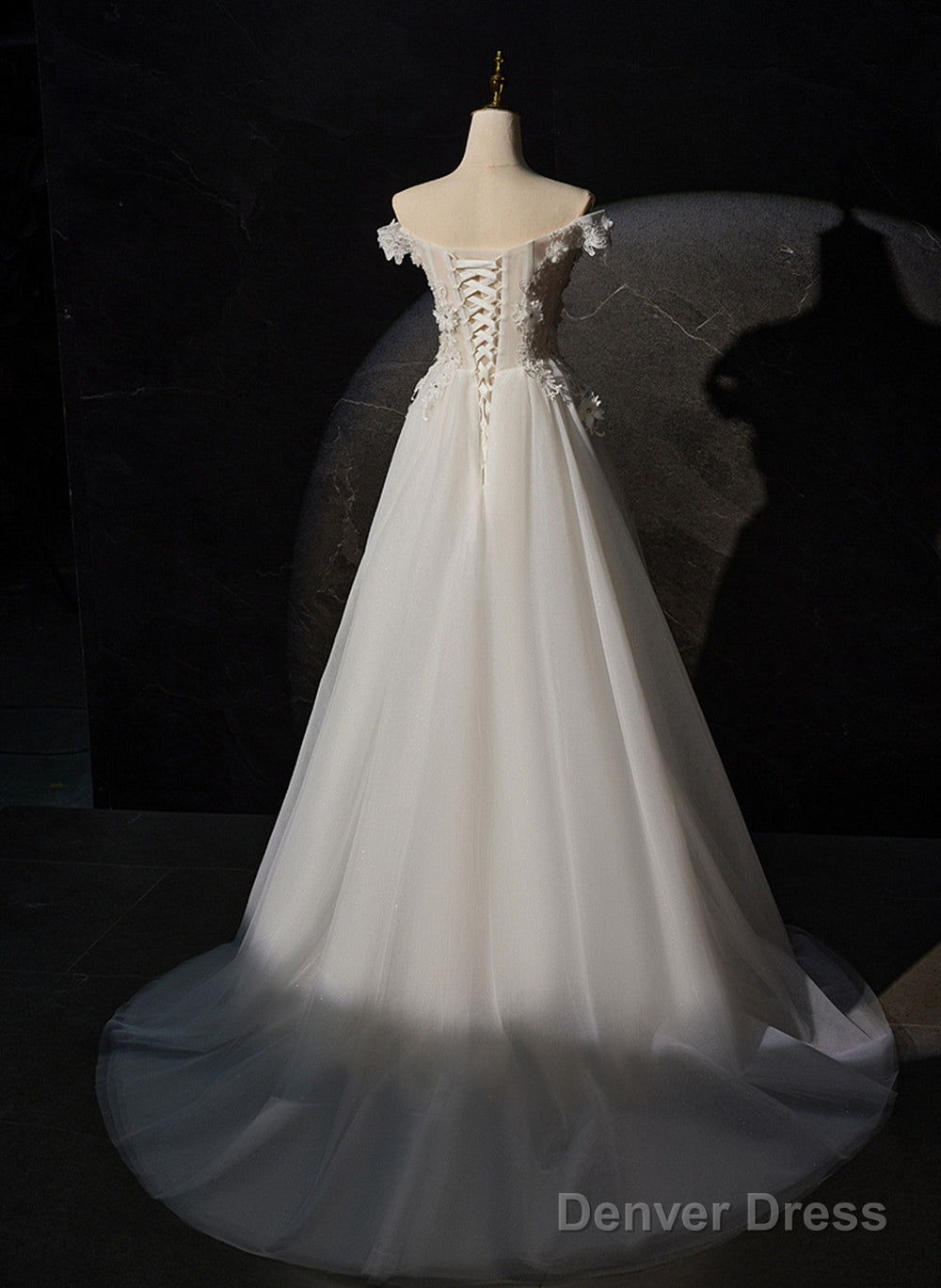 A-Line Off Shoulder White Flowers And Tulle Party Dress, White Long Formal Dress Prom Dress