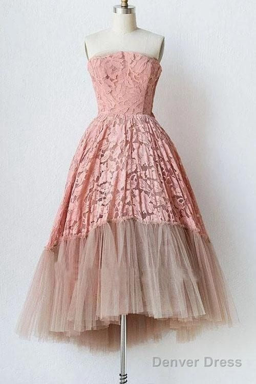 A Line Pink Lace Strapless Sleeveless Short Tulle Homecoming Dresses