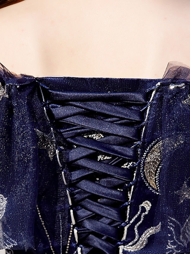 A-Line Prom Dresses Elegant Dress Wedding Guest Party Wear Floor Length Short Sleeve Off Shoulder Tulle with Embroidery Tiered