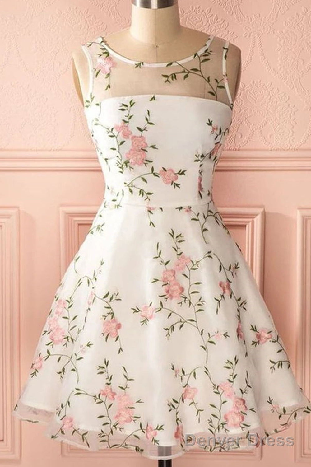 A Line Round Neck Short Lace Floral Prom Dresses, Short Lace Floral Formal Homecoming Dresses