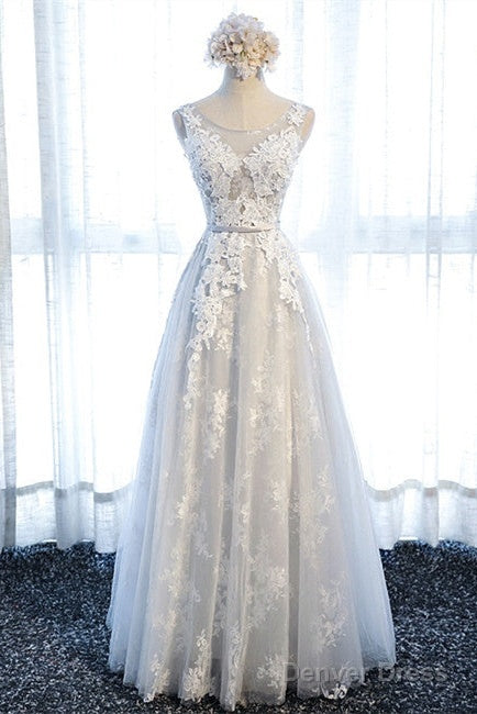 A Line Round Neck Sleeveless Lace Grey/Pink/Champagne Prom Dresses, Lace Formal Dresses, Evening Dresses