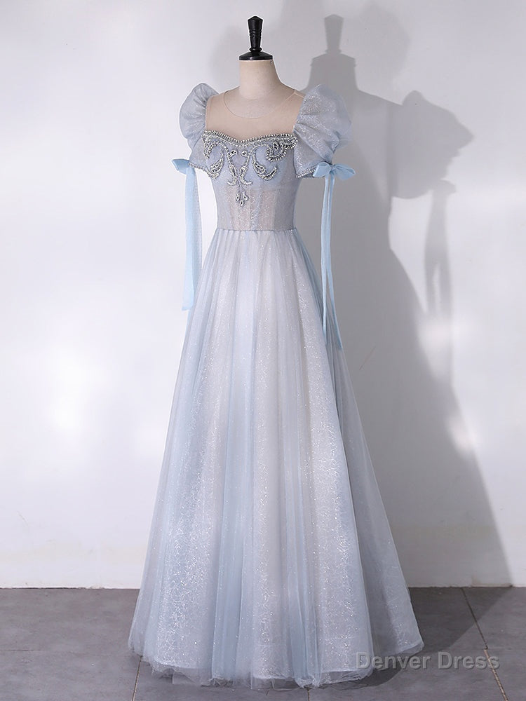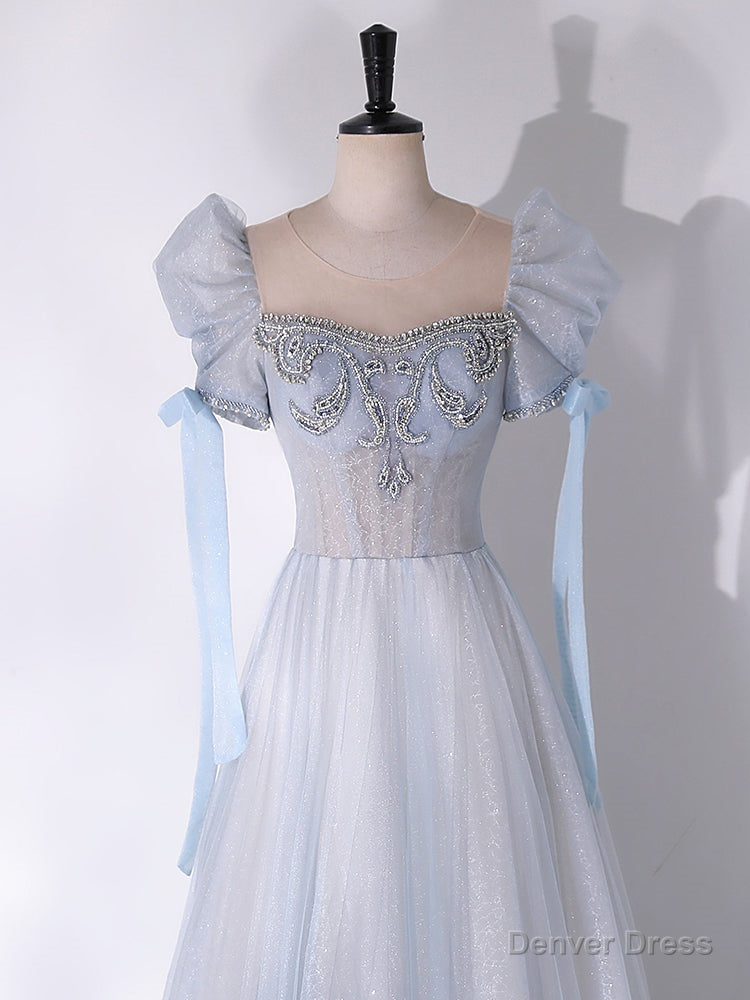 A-Line Scoop Neckline Tulle Light Blue Long Prom Dress with Beads