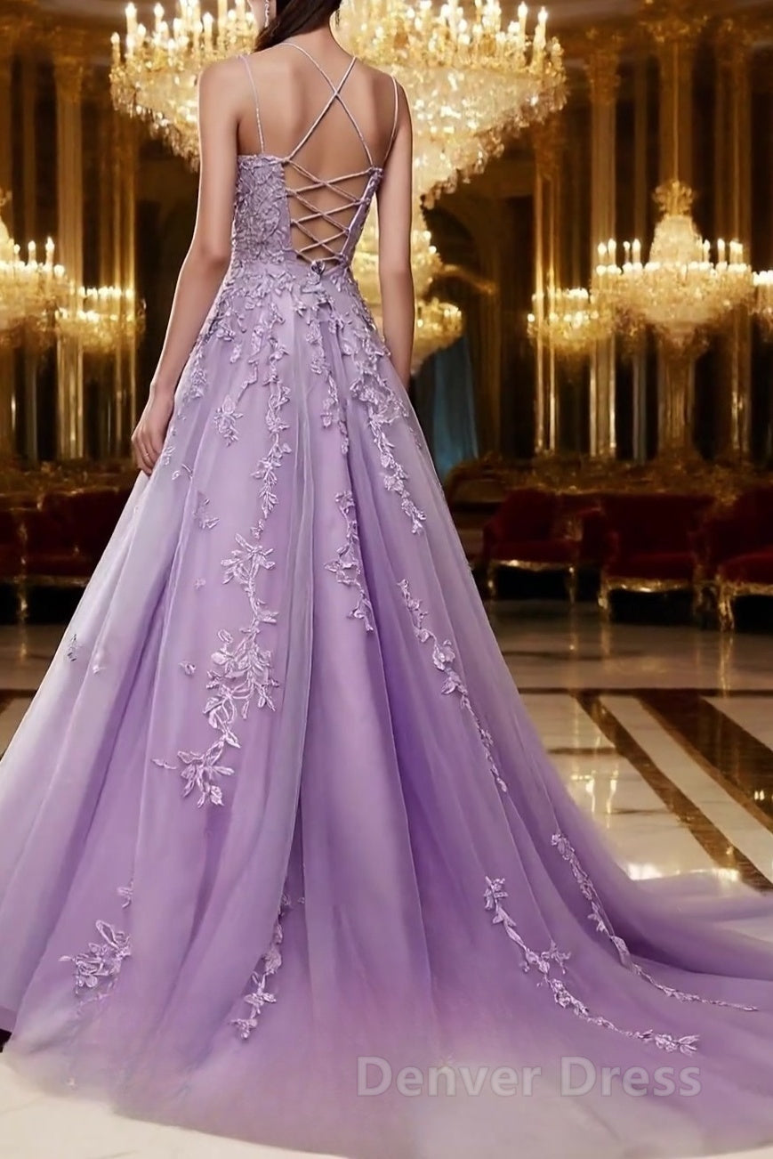 A-Line Spaghetti Straps Lace Lavender Prom Dresses Long With Appliques Pretty Dresses
