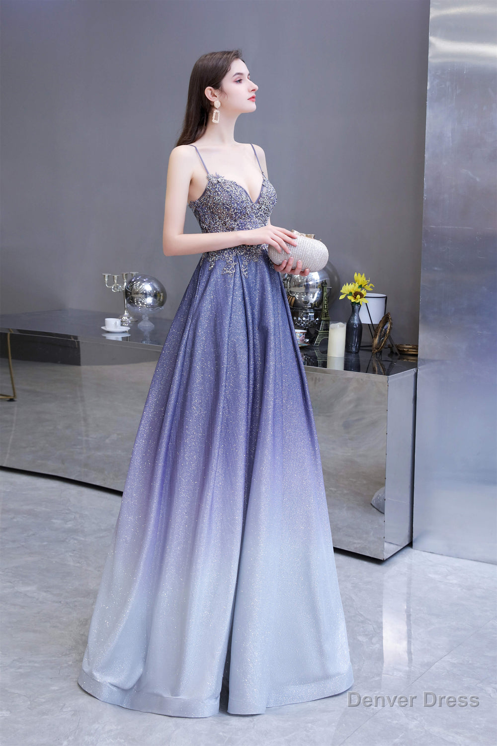 A-Line Spaghetti Straps Long Sequins Prom Dresses