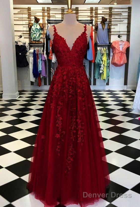 A-Line Spaghetti Straps V Neck Lace Prom Dress