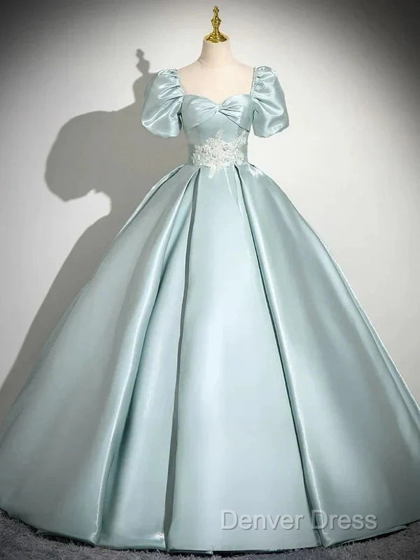 A-Line Sweetheart Neck Puff Sleeves Satin Quinceanera Dresses Blue Long Prom Dresses Elegant Evening Dresses