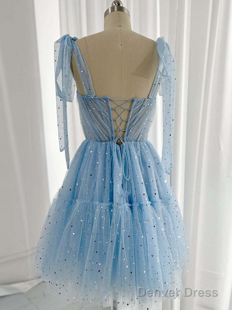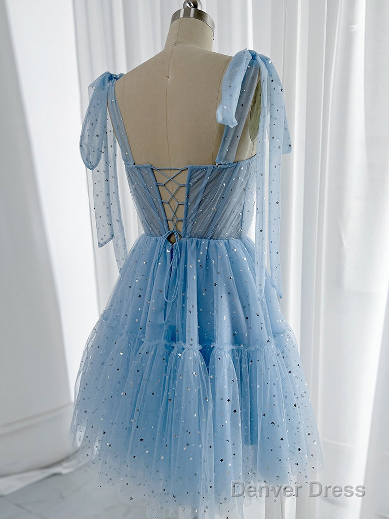 A-Line Sweetheart Neck Tulle Lace Blue Short Prom Dress, Blue Homecoming Dress