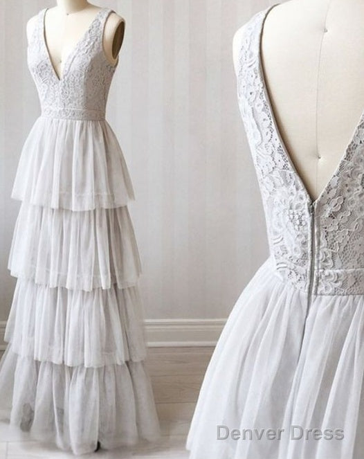 A Line V Neck Gray Lace Prom Dresses, V Neck Gray Lace Formal Graduation Bridesmaid Dresses