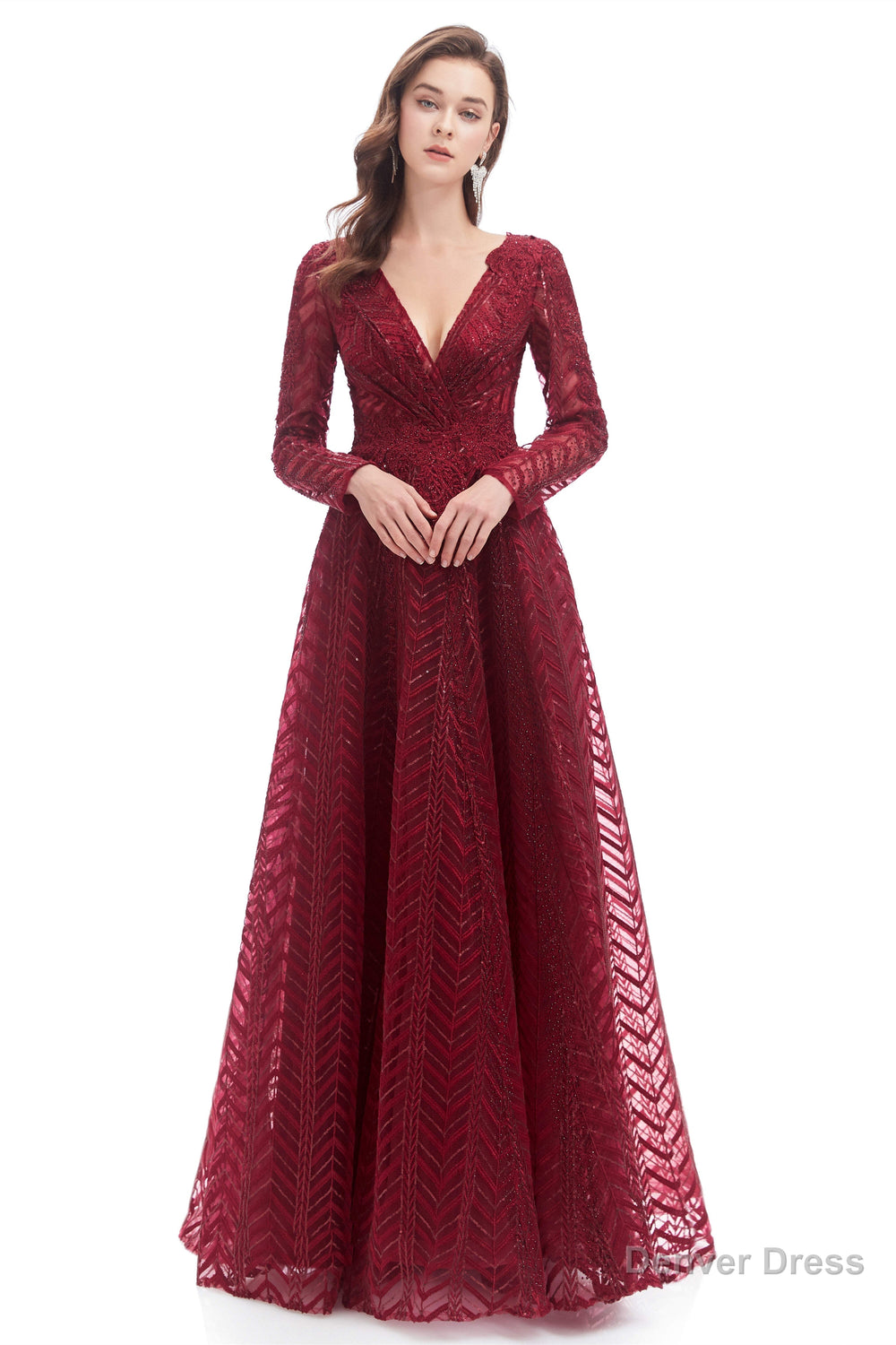 A-Line V Neck Long Sleeves Lace Long Prom Dresses