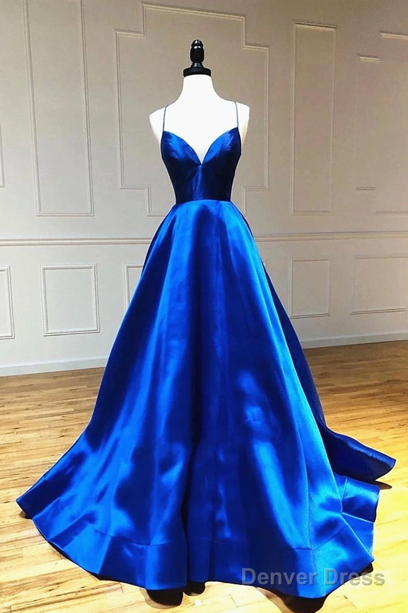 A Line V Neck Royal Blue Backless Prom Dresses, Open Back Royal Blue Formal Evening Graduation Dresses