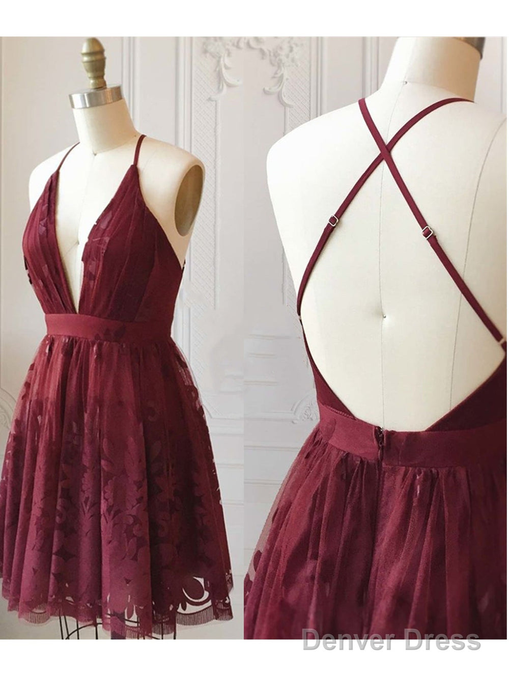 A Line V Neck Short Burgundy Lace Prom Dresses, Short Burgundy Lace Formal Homecoming Dresses
