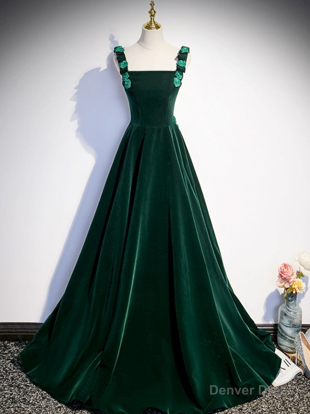 A-Line Velvet Green Long Prom Dresses, Green Formal Evening Dresses