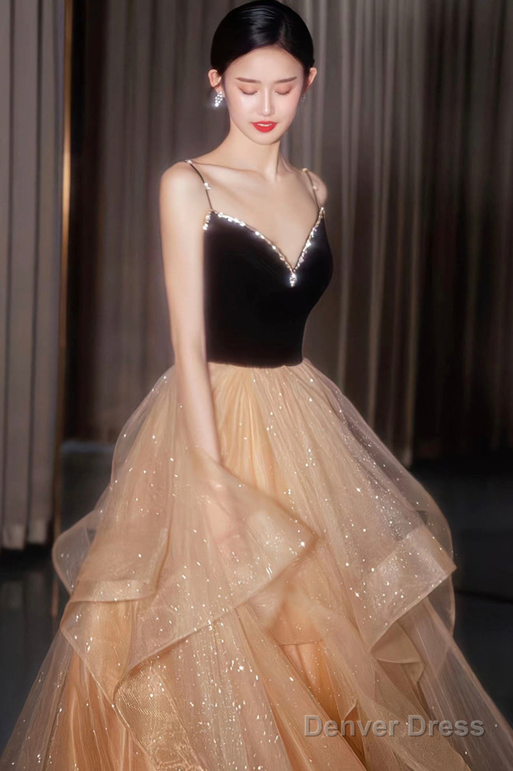 A-Line Velvet Tulle Long Prom Dress, Cute Spaghetti Strap Graduation Dress