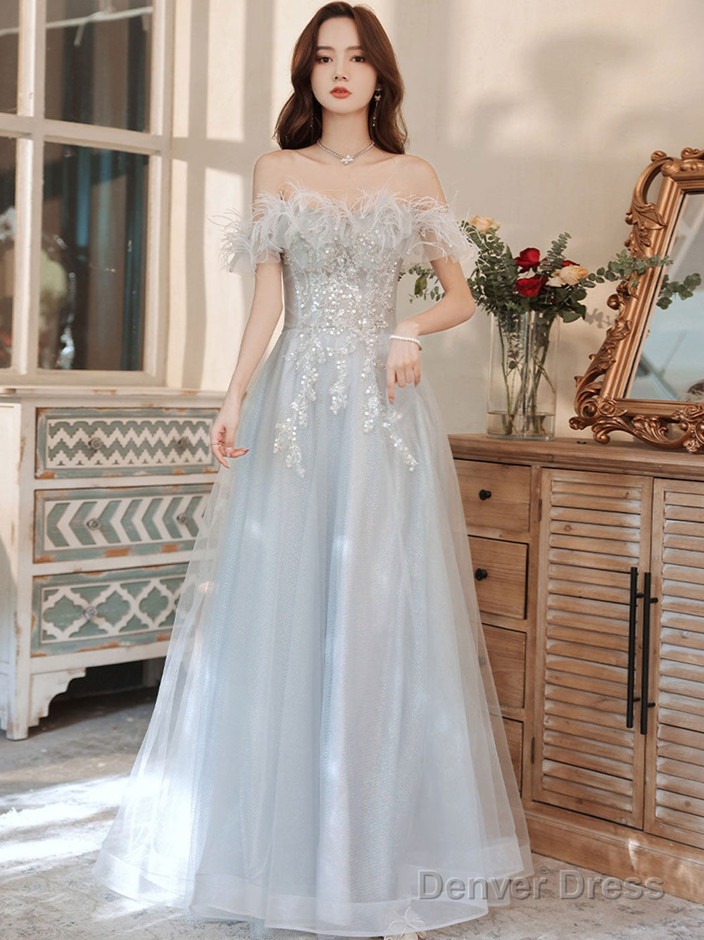 Aline Gray Long Prom Dresses, Gray Formal Graduation With Sequin Beading