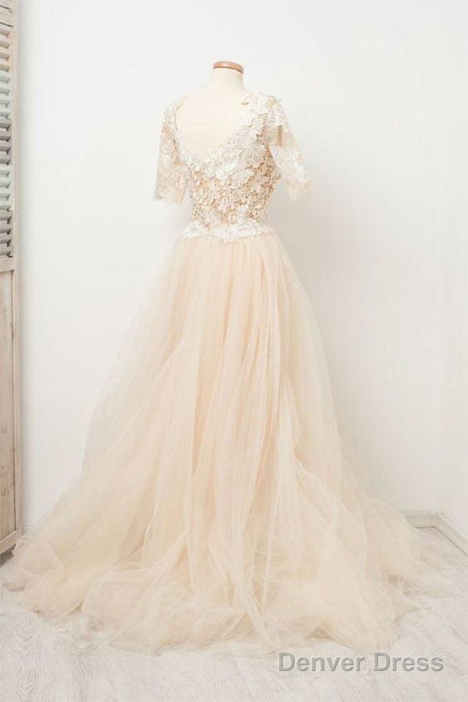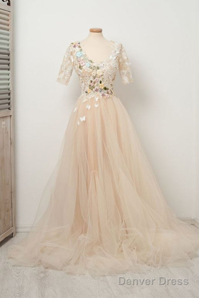 Appliques Tulle Lace Light Champagne Long Prom Dress