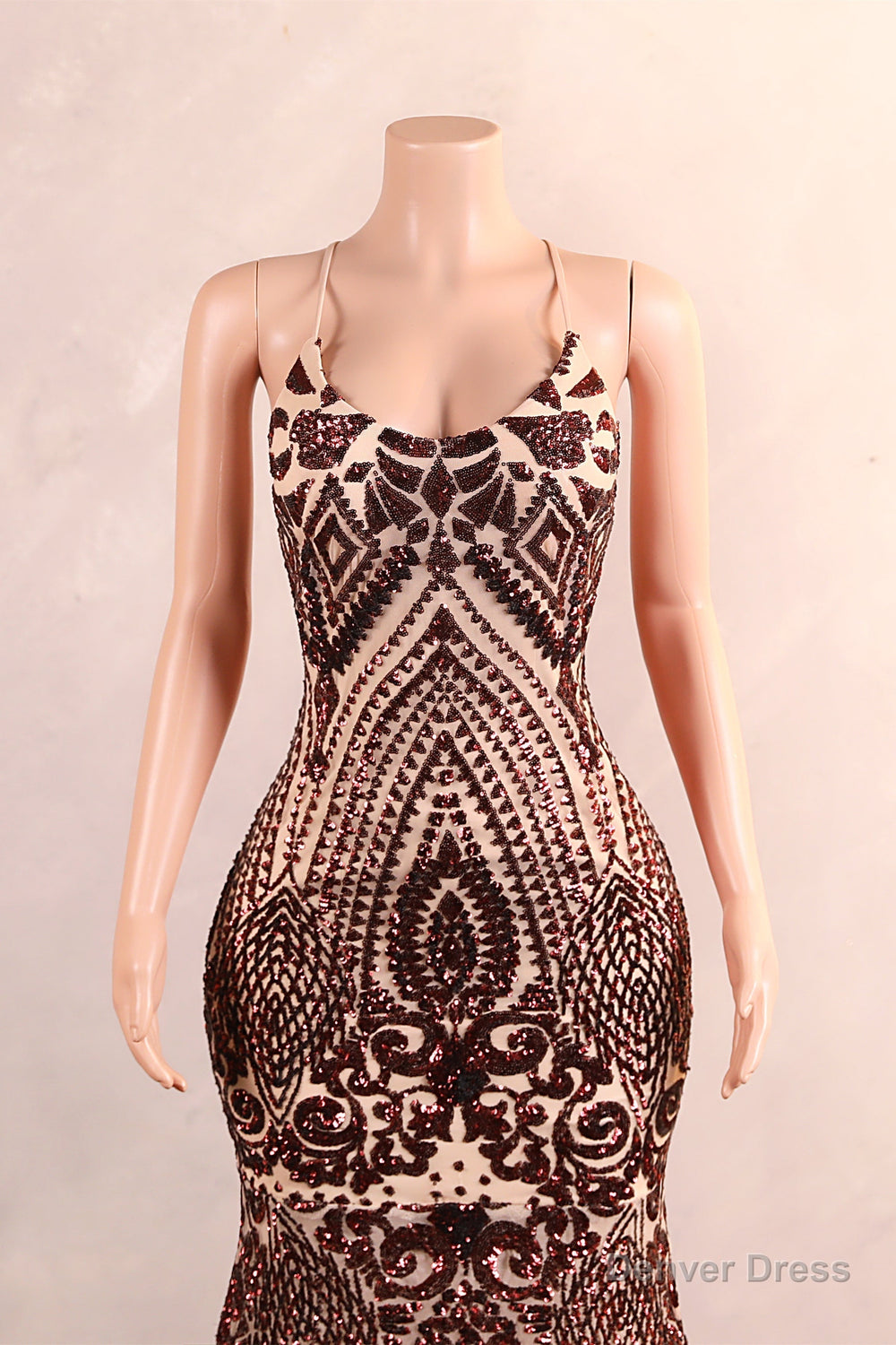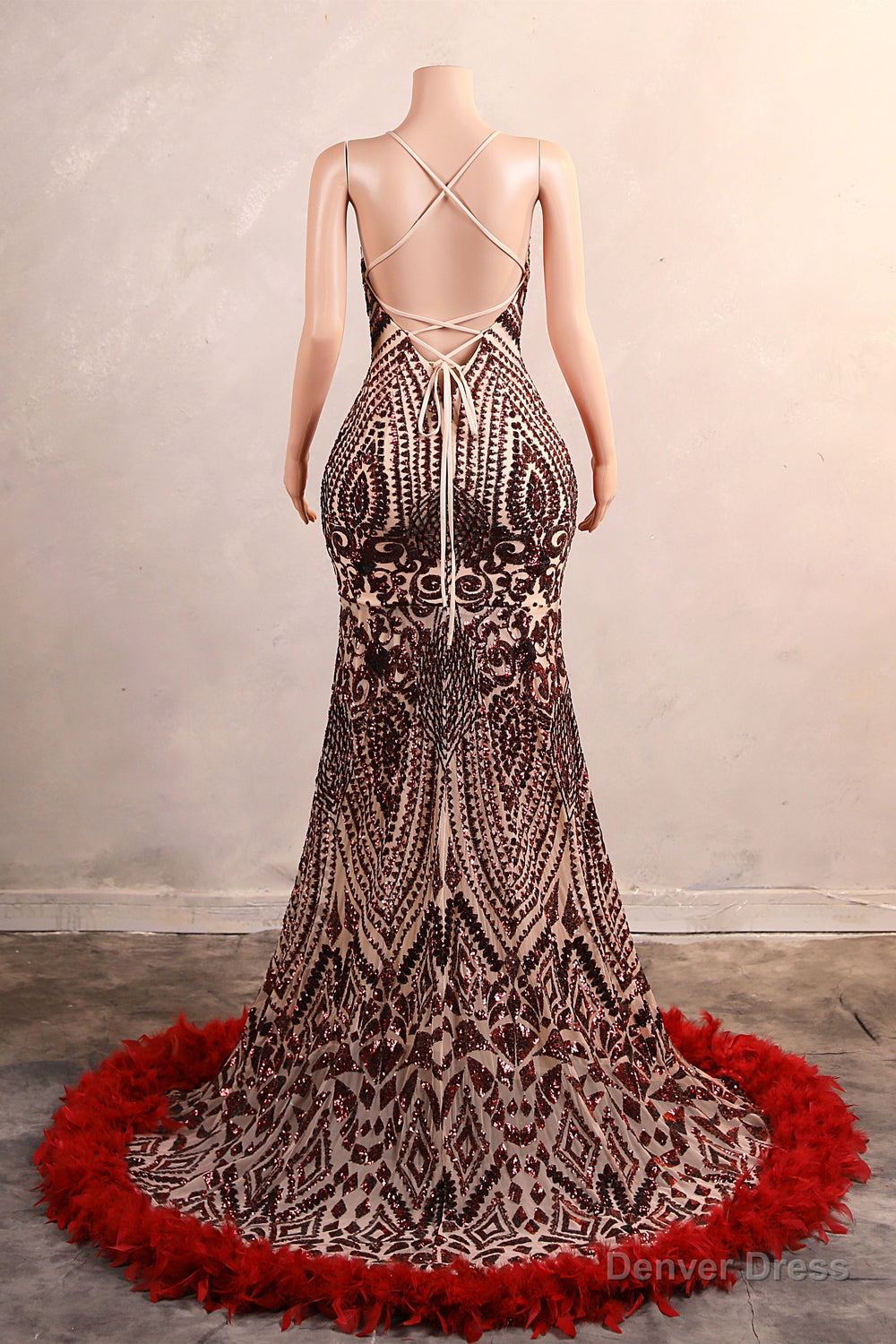 Backless Sequins Mermaid Prom Dresses Burgundy Party Evening Dresses with Feather Chapel Train