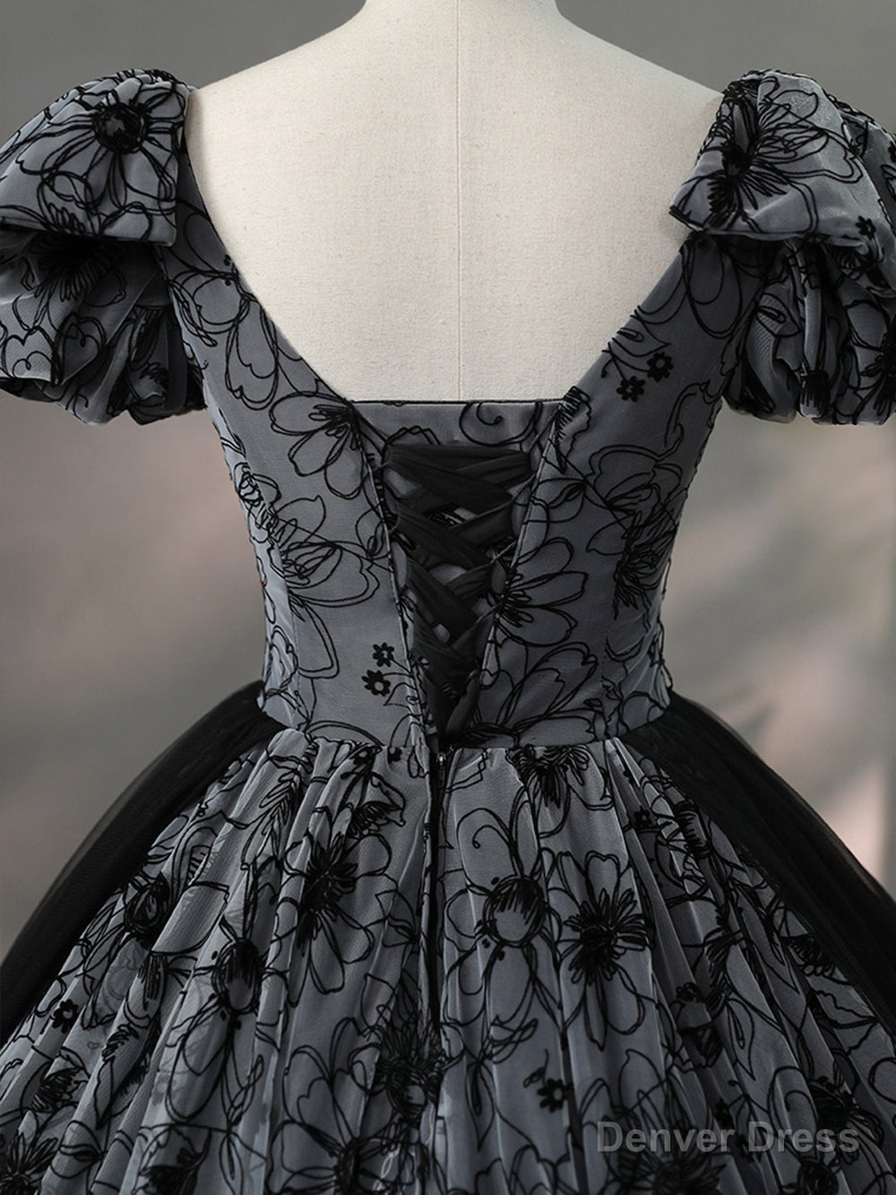 Beautiful Black Rhinestone Flower Prom Dress, Black V-Neck Short Sleeve Evening Dress