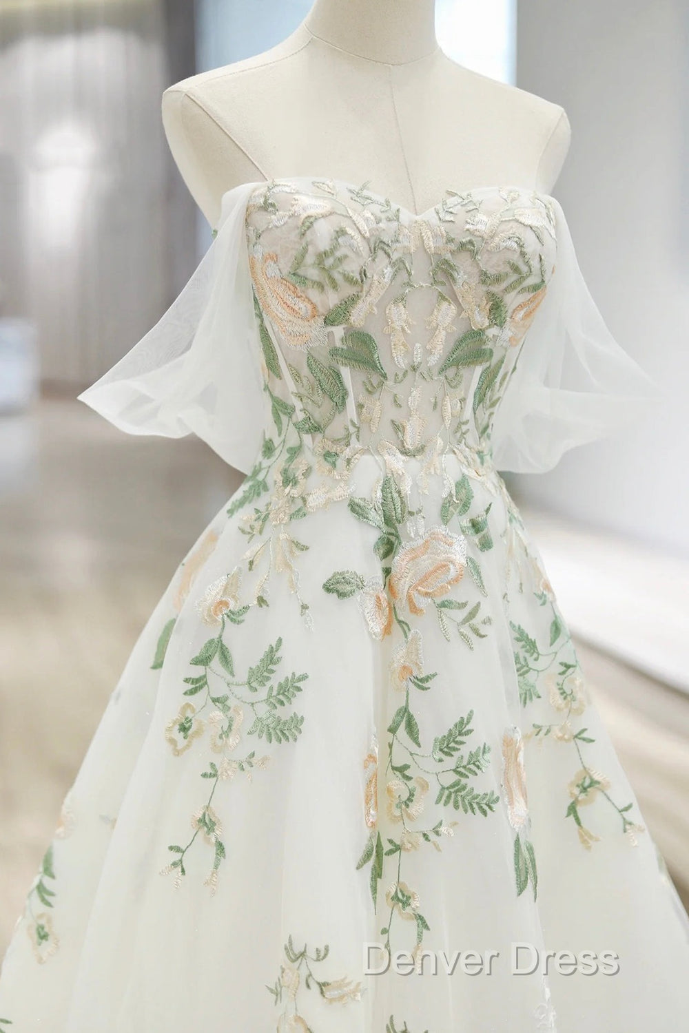 Beautiful Floral Lace Tulle Long Prom Dresses, White Off The Shoulder Evening Party Dresses