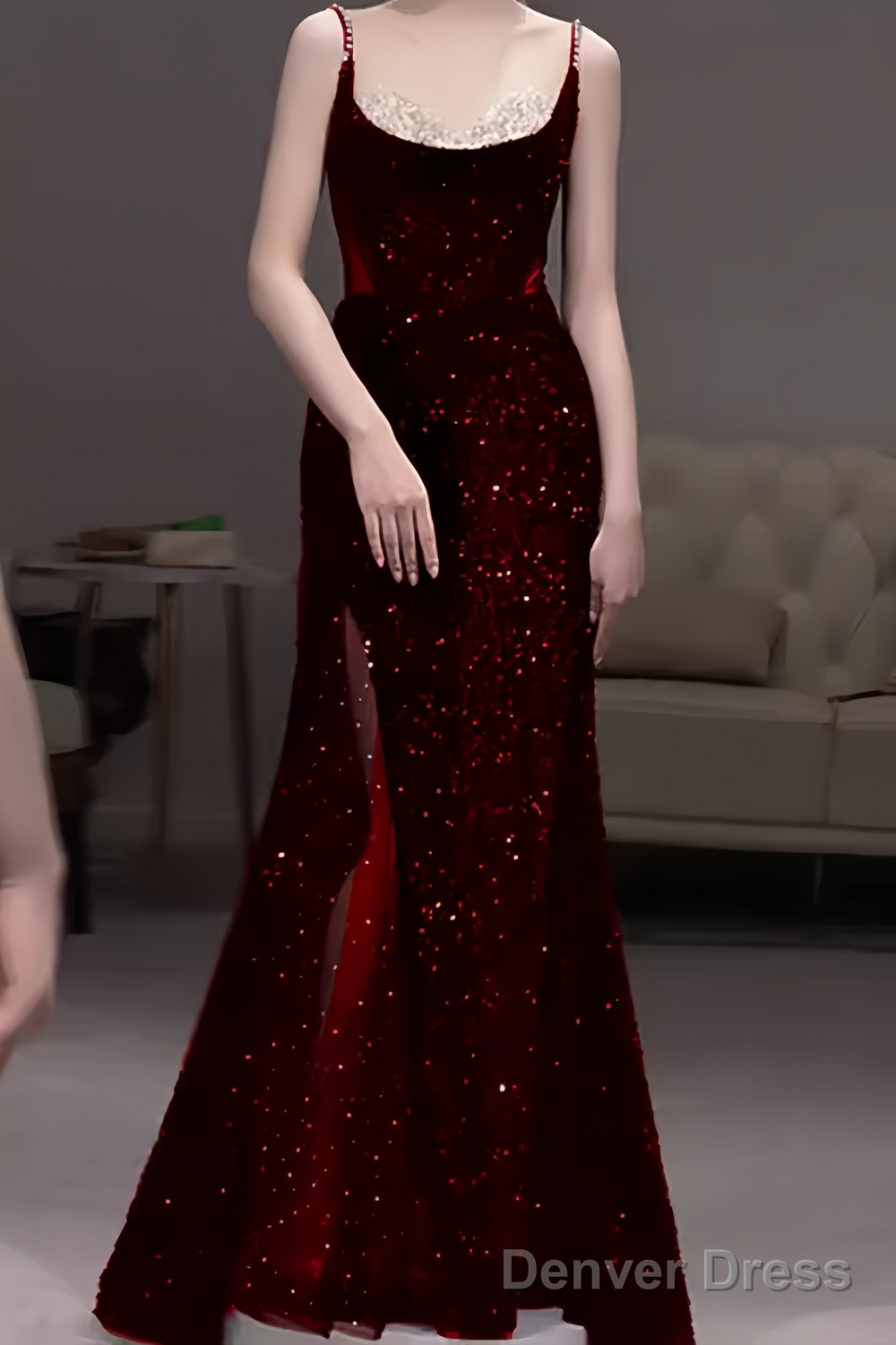 Beautiful Mermaid Straps Slit Burgundy Long Prom Dress