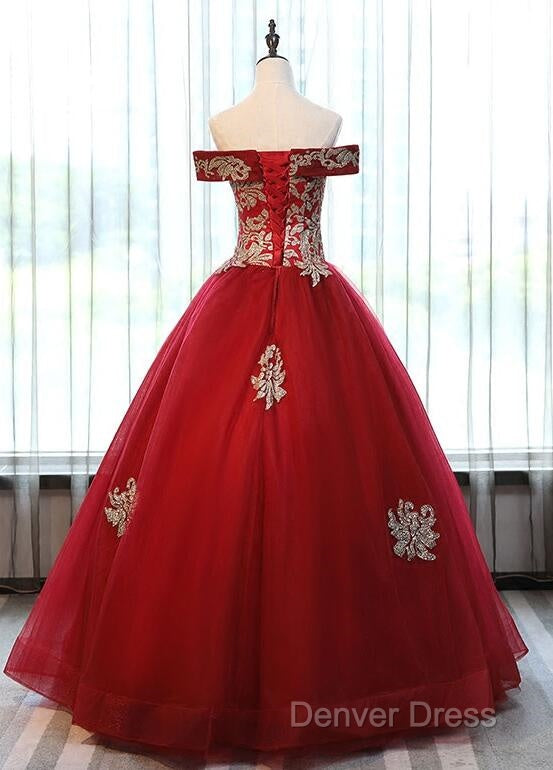 Beautiful Red Off Shoulder Long Sweet 16 Dresses With Gold Lace Top, Party Dresses