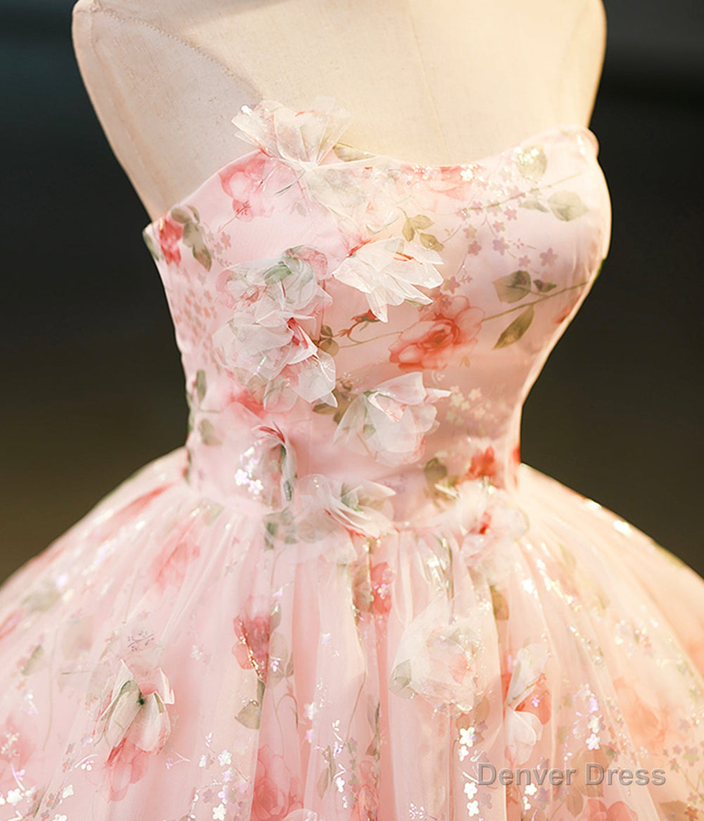 Beautiful Strapless Tulle Flower Long Pink Ball Gown