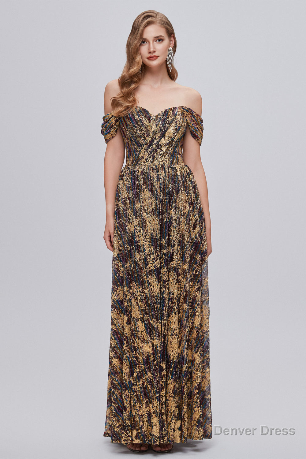 Black and Brown Floral Print Off-the-Shoulder A-Line Long Prom Dress