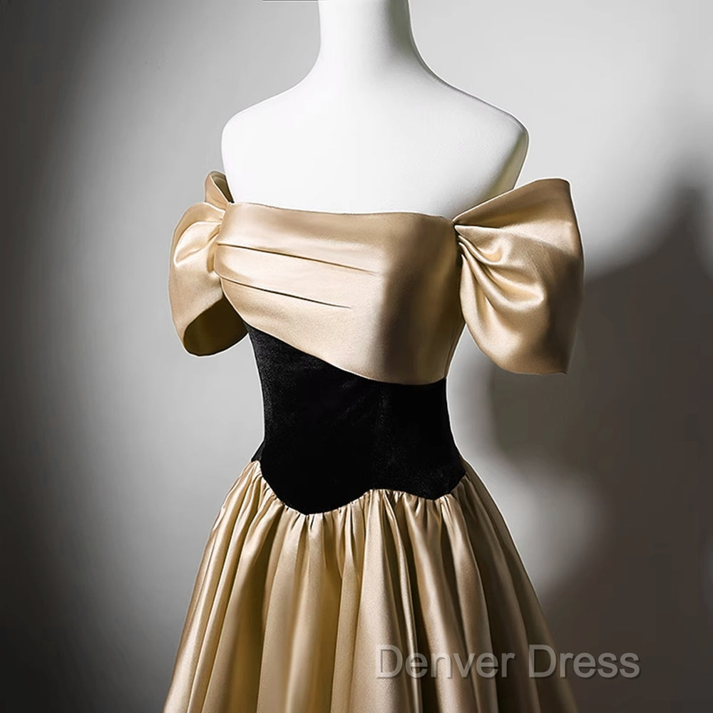 Black And Champagne Satin Long Party Dresses, Off Shoulder Satin Prom Dresses