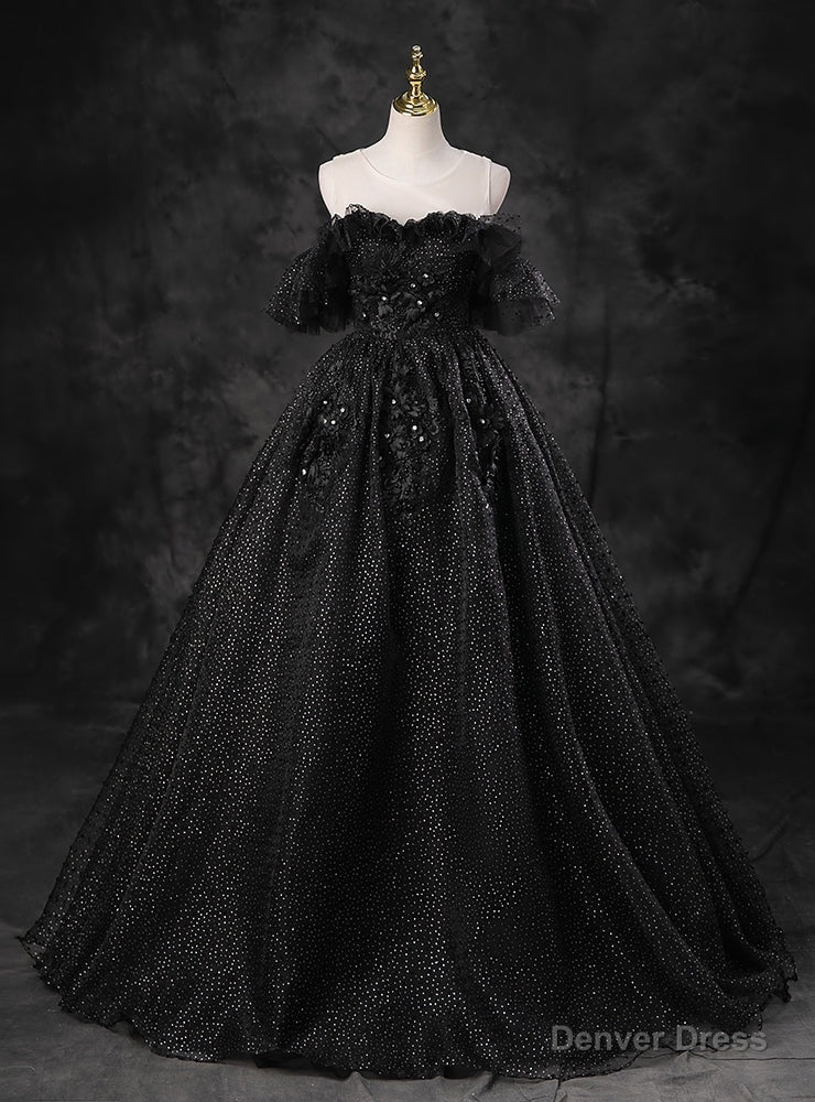 Feel the magic of the night in this enchanting black prom dress, a masterpiece of design and detail! The dresss surface is studded with countless sequins, catching the light and casting an ethereal glow. Its off-the-shoulder ruffle sleeves drape beautifully, adding a touch of drama and grace. The voluminous skirt is crafted to twirl and flow, making every step you take a statement of poise and grandeur. This gown isnt just a piece of clothing; its an artifact of enchantment, tailored for a prom queen.