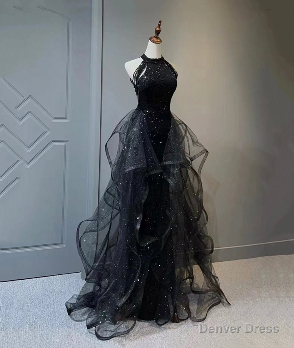 Black Halter Shiny Tulle Long Prom Dress, Black Tulle Evening Dress with Sequins