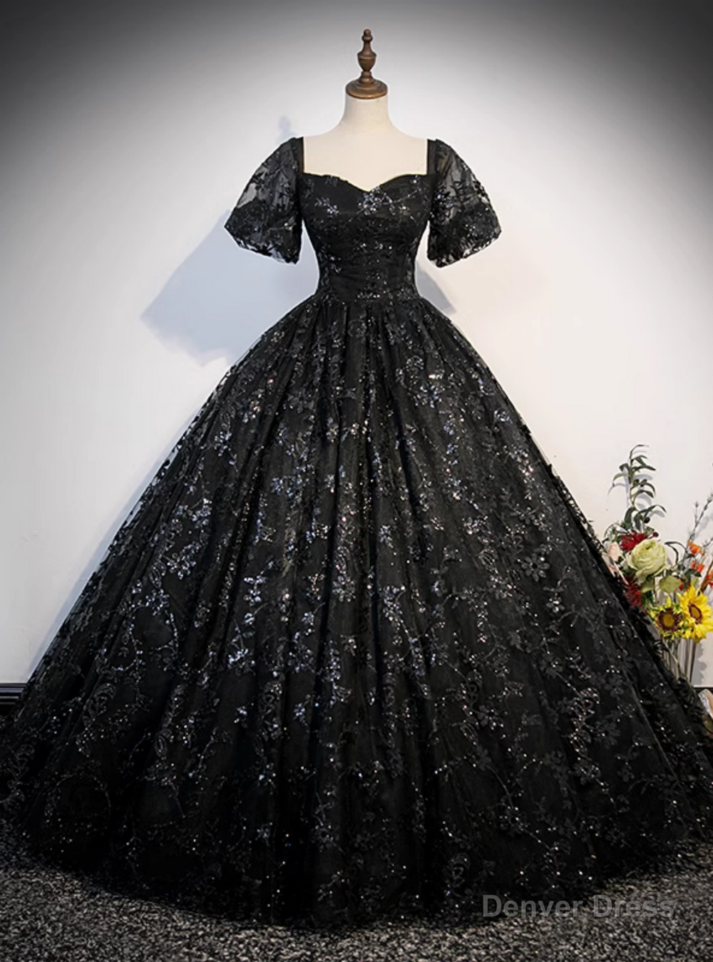 Silhouetted against the evening, is this the dress that will make your prom night unforgettable This breathtaking gown boasts a bodice lavishly adorned with sequins and lace, creating a pattern reminiscent of the night sky. The square neckline is framed by delicate cap sleeves, adding a touch of vintage glamour. As the dress unfolds, the full skirt flares out in a spectacular display of black tulle, sprinkled with sequins that catch the light like distant stars. This dress is a masterpiece of elegance and drama, perfect for the prom-goer who commands the spotlight with sophistication and style.