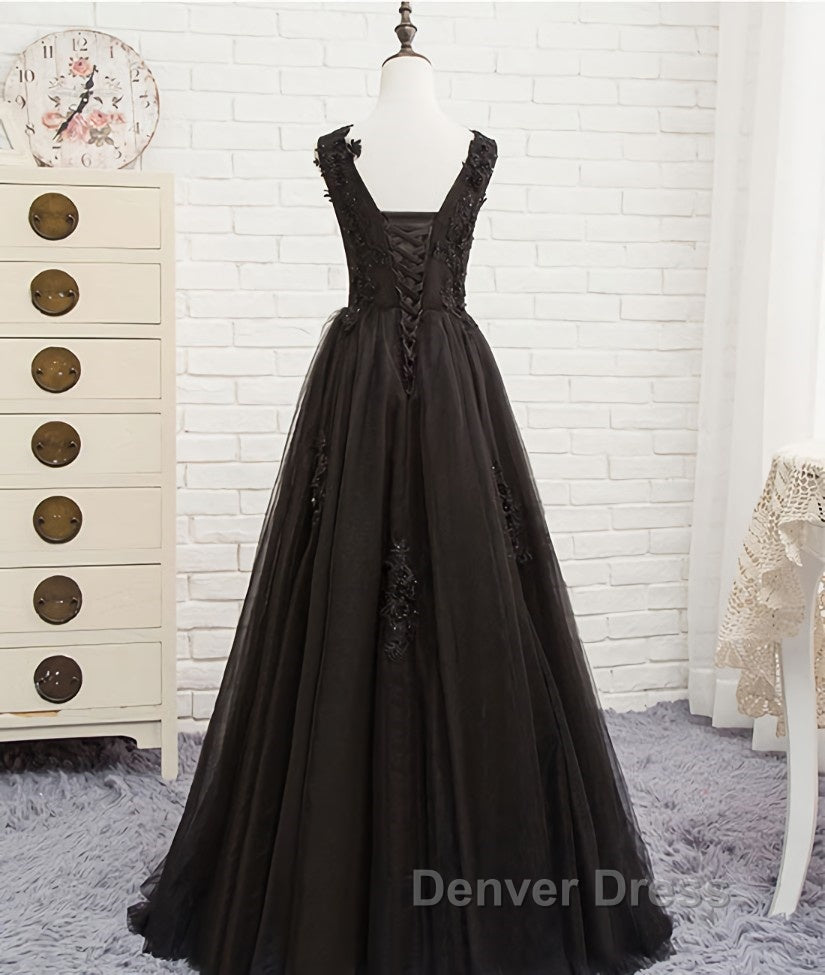 Black round neck tulle lace long prom Dresses, black evening Dresses