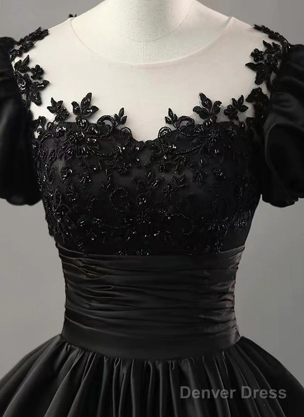 Black Satin Short Sleeves Round Neckline Party Dress, Black Sweet 16 Dress