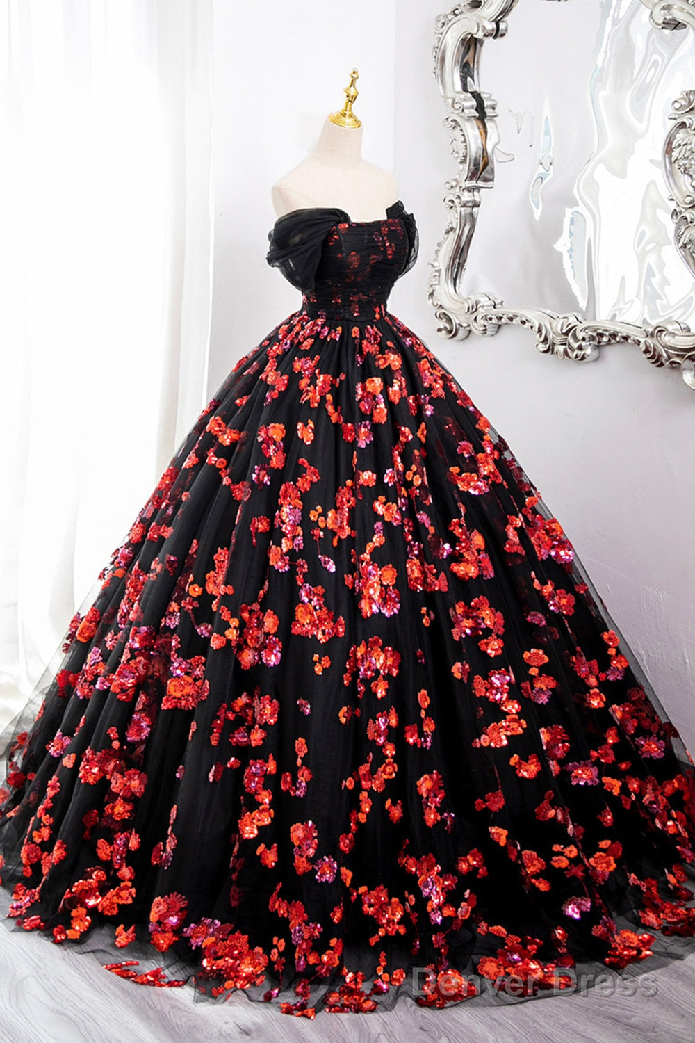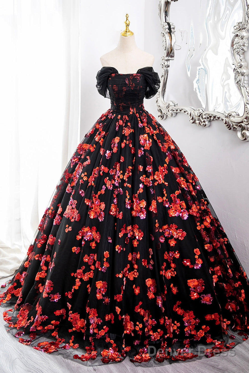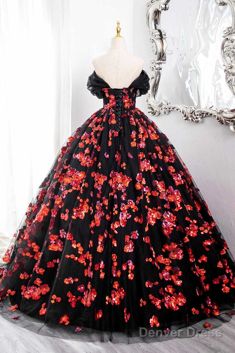 Black Tulle And Red Sequins Long Formal Dress, Off The Shoulder Evening Dress