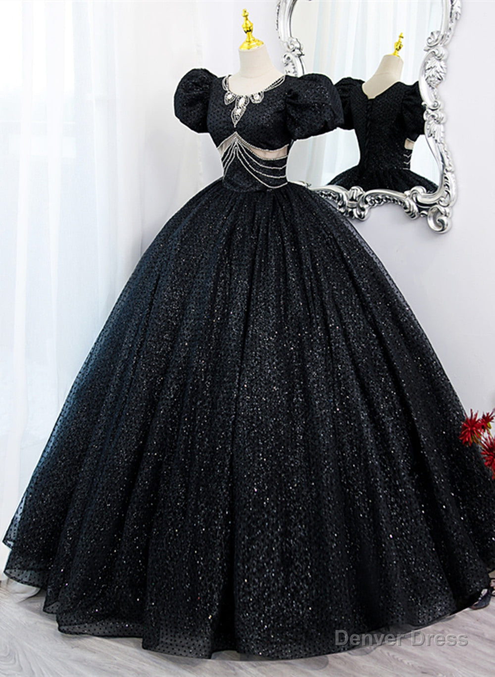Black Tulle Beaded Short Sleeves Prom Dress, Black Tulle Formal Dress