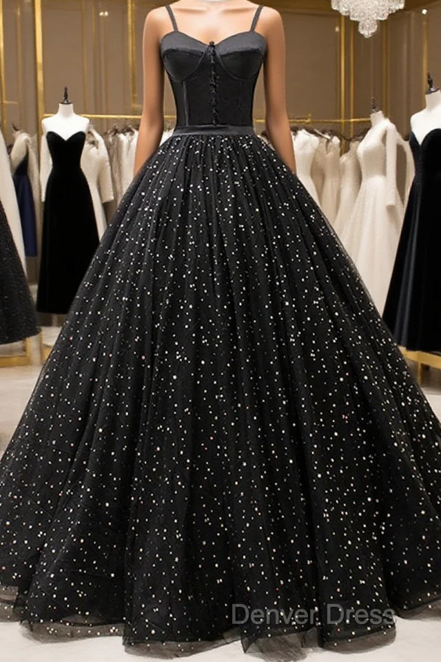 Black Tulle Long Prom Dresses, Black Spaghetti Straps Formal Evening Gown