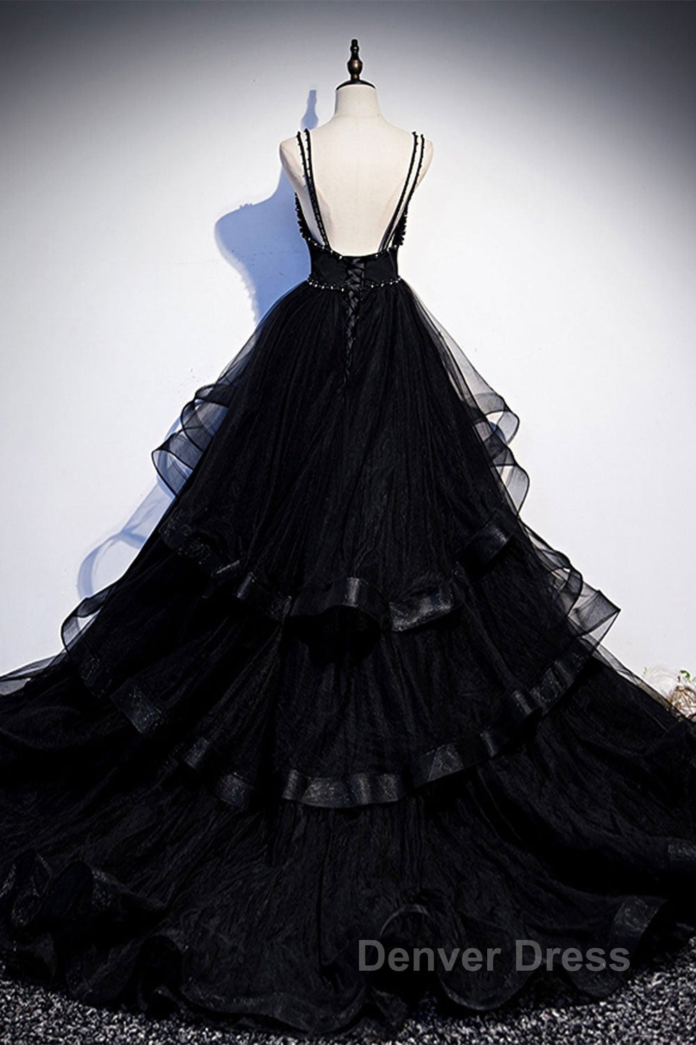 Black Tulle Open Back V Neck Beaded Layered Long Prom Dresses