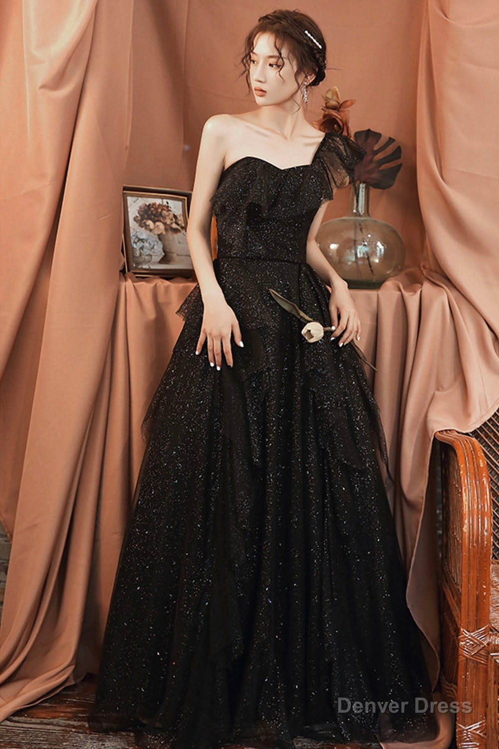 Black tulle sequins long prom dress A line evening dress